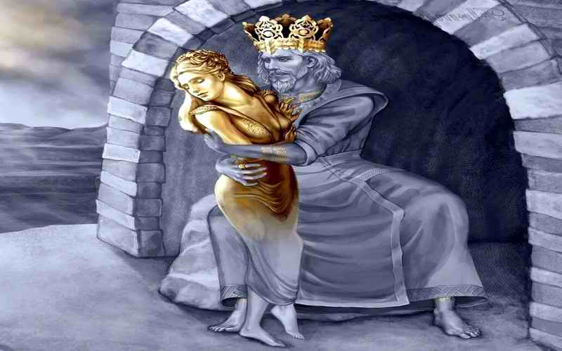 Uplašena njegova kćerka je dojurila da ga zagrli i utješi ali čim ju je zagrlio, ona se pretvorila u zlatnu statuu.